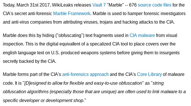 Marble forms part of the CIA’s anti-forensics approach and the CIA’s Core Library of malware code. It is “[D]esigned to allow for flexible and easy-to-use obfuscation” as “string obfuscation algorithms (especially those that are unique) are often used to link malware to a specific developer or development shop.”