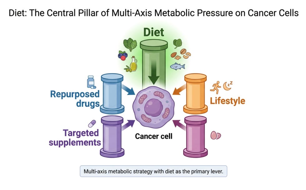 At its core, the multi-axis framework is designed to impose coordinated metabolic stress on the tumor: lowering glucose availability, suppressing insulin/IGF-1 signaling, activating AMPK, inhibiting mTOR, and destabilizing mitochondrial function. A high-carbohydrate diet directly counteracts each of these mechanisms.